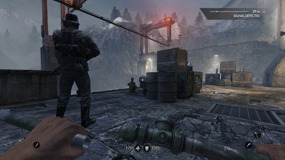 Si le prologue était tout à fait sympathique, j’ai trouvé le premier niveau du jeu un poil pénible parce que reposant essentiellement sur des esquives de gardes où ça se transforme en désastre et défaite dès qu’on se fait repérer. Heureusement, la situation s’améliore grandement par la suite, une fois qu’on est correctement équipé pour ventiler du nazi par lot de dix. Et on ne se prive pas trop de ce côté.
