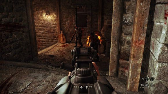 On retrouve donc B. J. Blazkowicz un peu avant le début du jeu The New Order, alors qu’il s’apprête à infiltrer le fameux château Wolfenstein pour trouver un dossier permettant de localiser la planque du Boucher (que l’on revoit pas mal dans The New Order). Évidemment, tout ne se passe pas comme prévu et on fini par se retrouver avec pour seul arme un tuyau de plomb. Lequel permet aussi de grimper le long de certains murs, une mécanique assez sympathique. Et accessoirement de faire rendre gorge, littéralement, à des nazillons.
